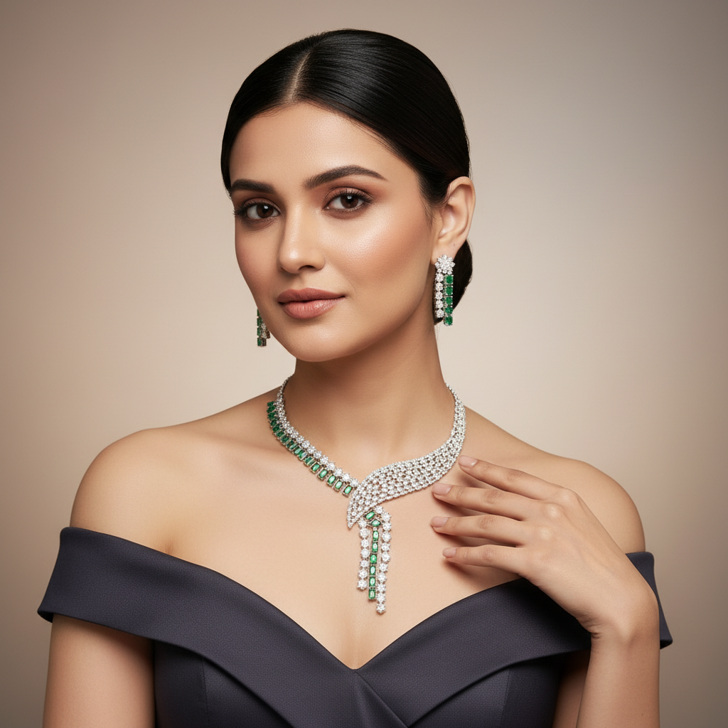 Premium-quality American Diamond set adorned with exquisite Zirconia stones, perfect for festive celebrations, weddings, and your upcoming special occasions.