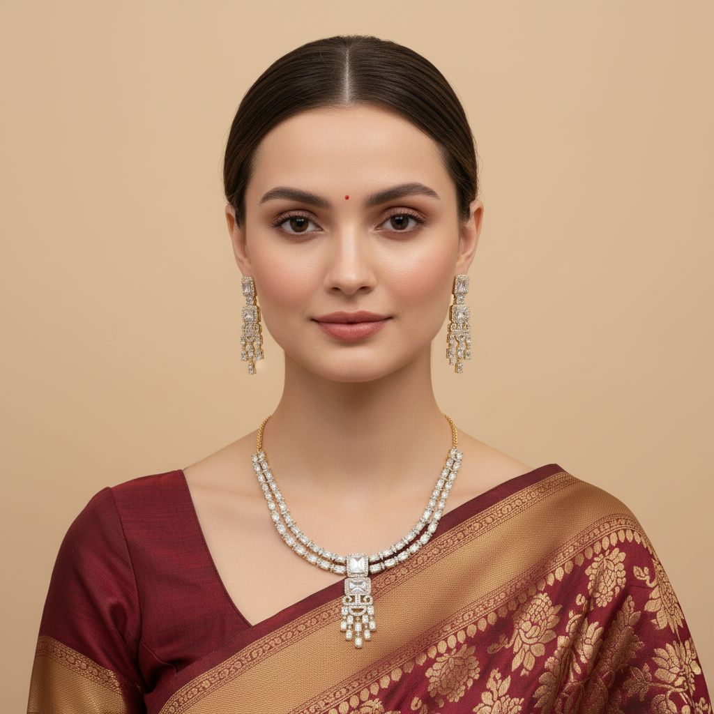 Premium-quality American Diamond set adorned with exquisite Zirconia stones, perfect for festive celebrations, weddings, and your upcoming special occasions.