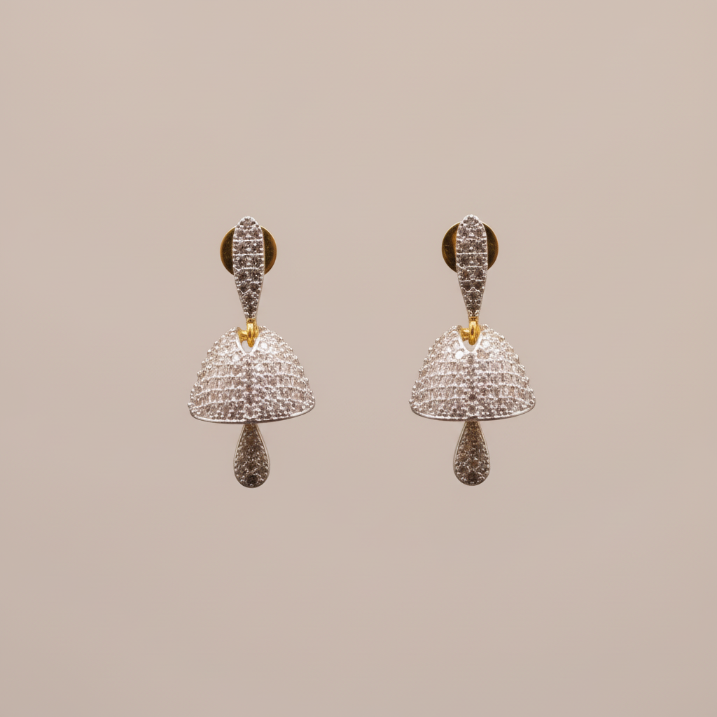 This elegant pair of jhumkis features a stunning American Diamond arrangement that catches the light and draws every eye at your next celebration. These earrings are the perfect pick to elevate your festive look with charm and sparkle