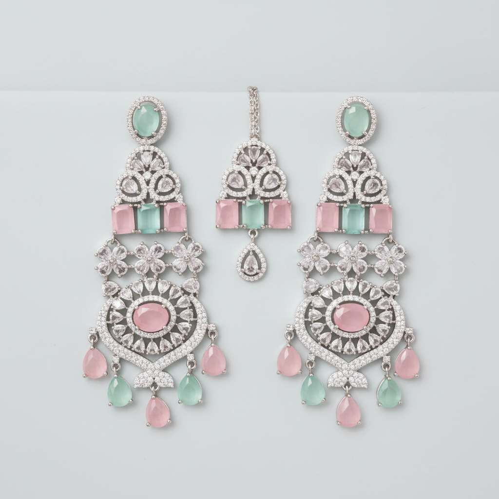 Premium-quality American Diamond set adorned with exquisite Zirconia stones, perfect for festive celebrations, weddings, and your upcoming special occasions.