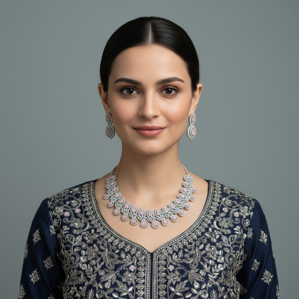 Premium-quality American Diamond set adorned with exquisite Zirconia stones, perfect for festive celebrations, weddings, and your upcoming special occasions.