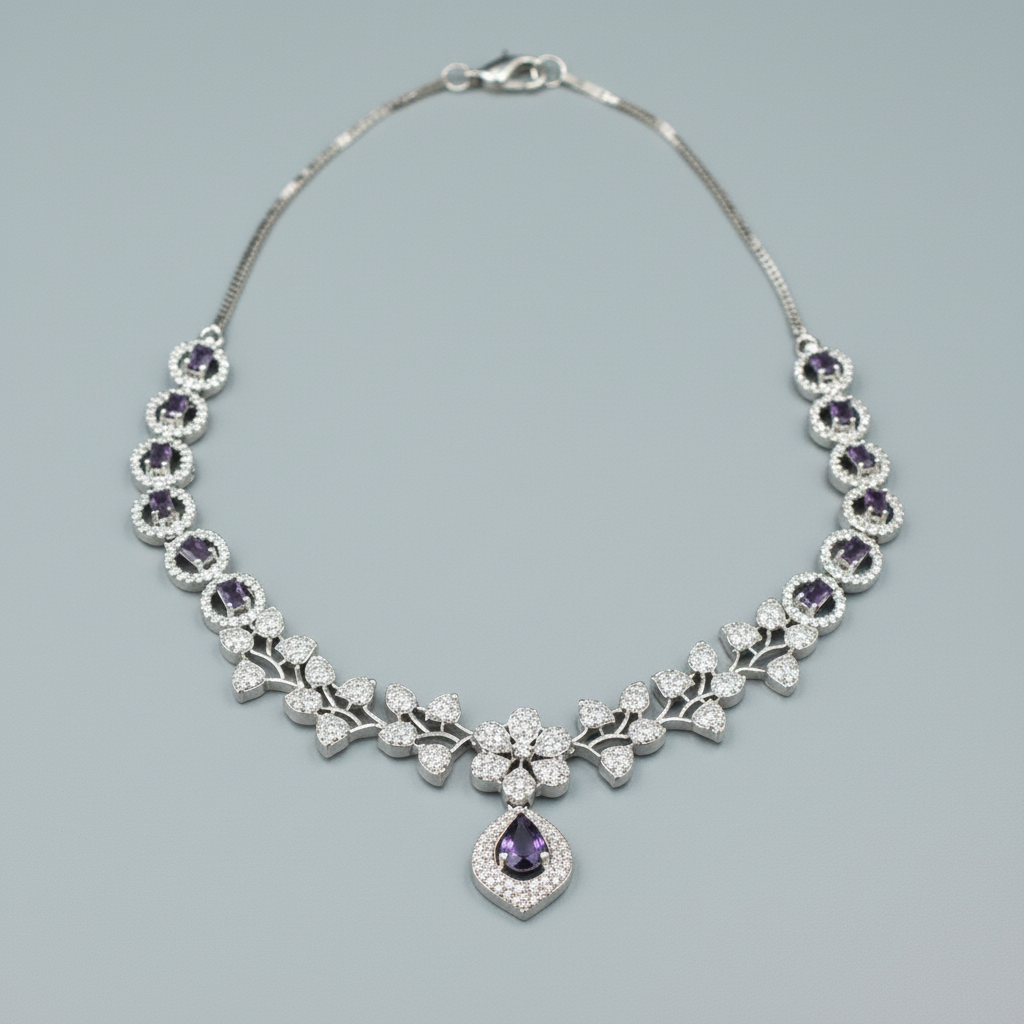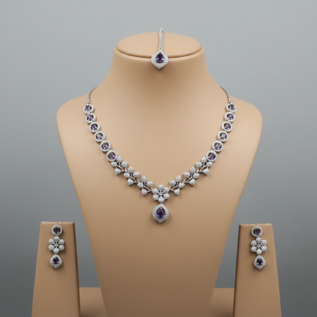 Purple Manjari American Diamond Necklace set with Maangtika