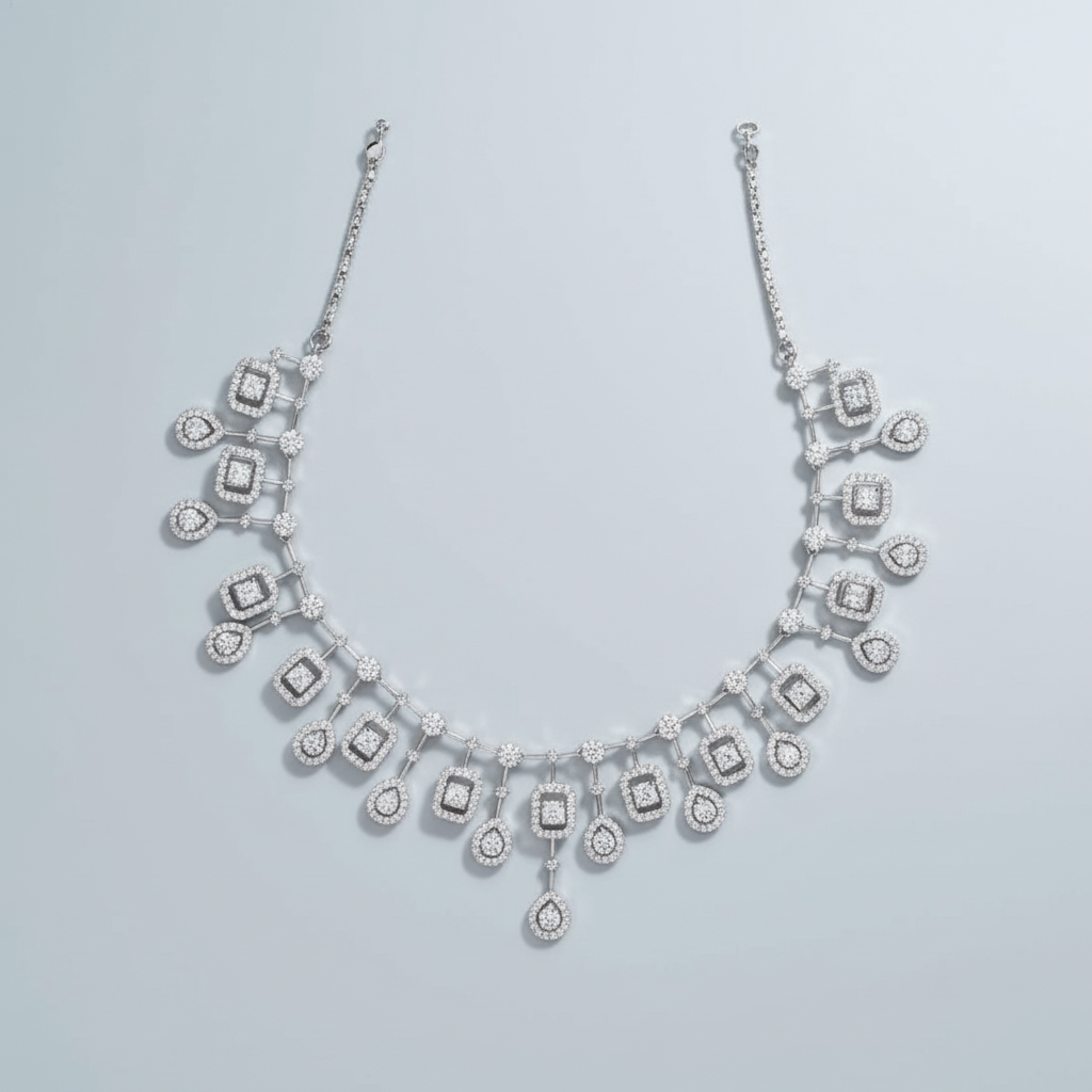 Premium-quality American Diamond set adorned with exquisite Zirconia stones, perfect for festive celebrations, weddings, and your upcoming special occasions.